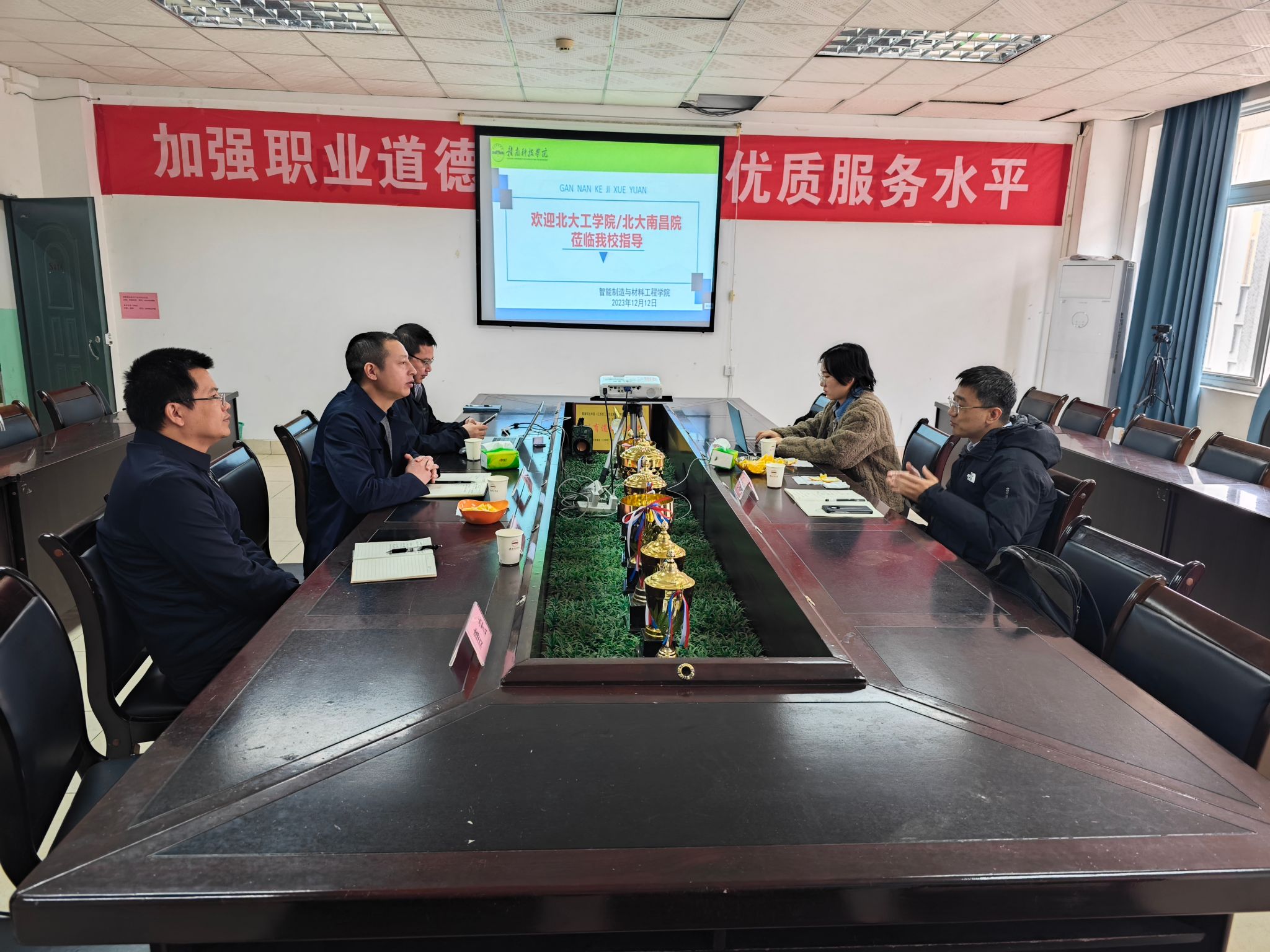 12月12日上午,北大工学院特聘研究员范瑞峰、北大南昌院对外合作部高级经理漆凤一行来校考察交流,座谈会在工程院416会议室举行,刘辉、关开荣等参加座谈会。