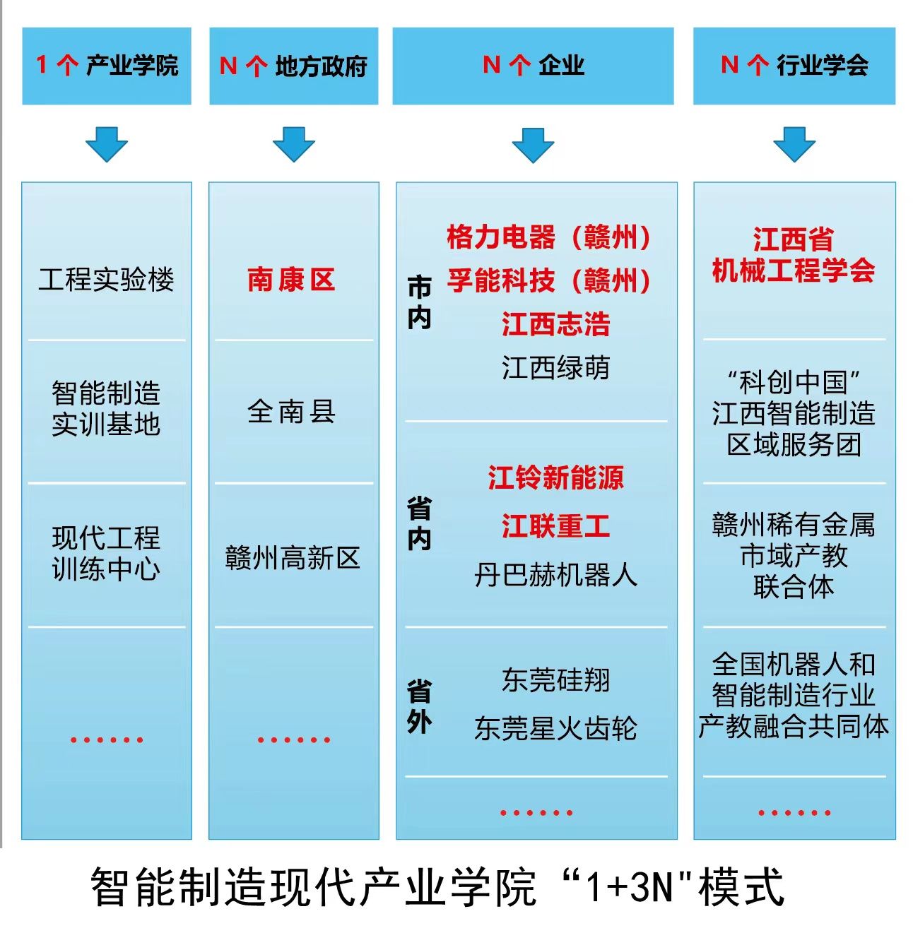 智能制造现代产业学院成立于2021年9月,依托学校机械电子工程、机器人工程与智能制造工程等专业,同时涵盖机械工程、自动化、电气工程及其自动化、材料成型及控制工程与电子信息工程等专业组成的智能制造专业群,由赣州市南康区、格力电器(赣州)有限公司、孚能科技(赣州)股份有限公司、江西志浩电子科技有限公司、江联重工集团股份有限公司、江西江铃集团新能源汽车有限公司以及江西省机械工程学会等单位共建。