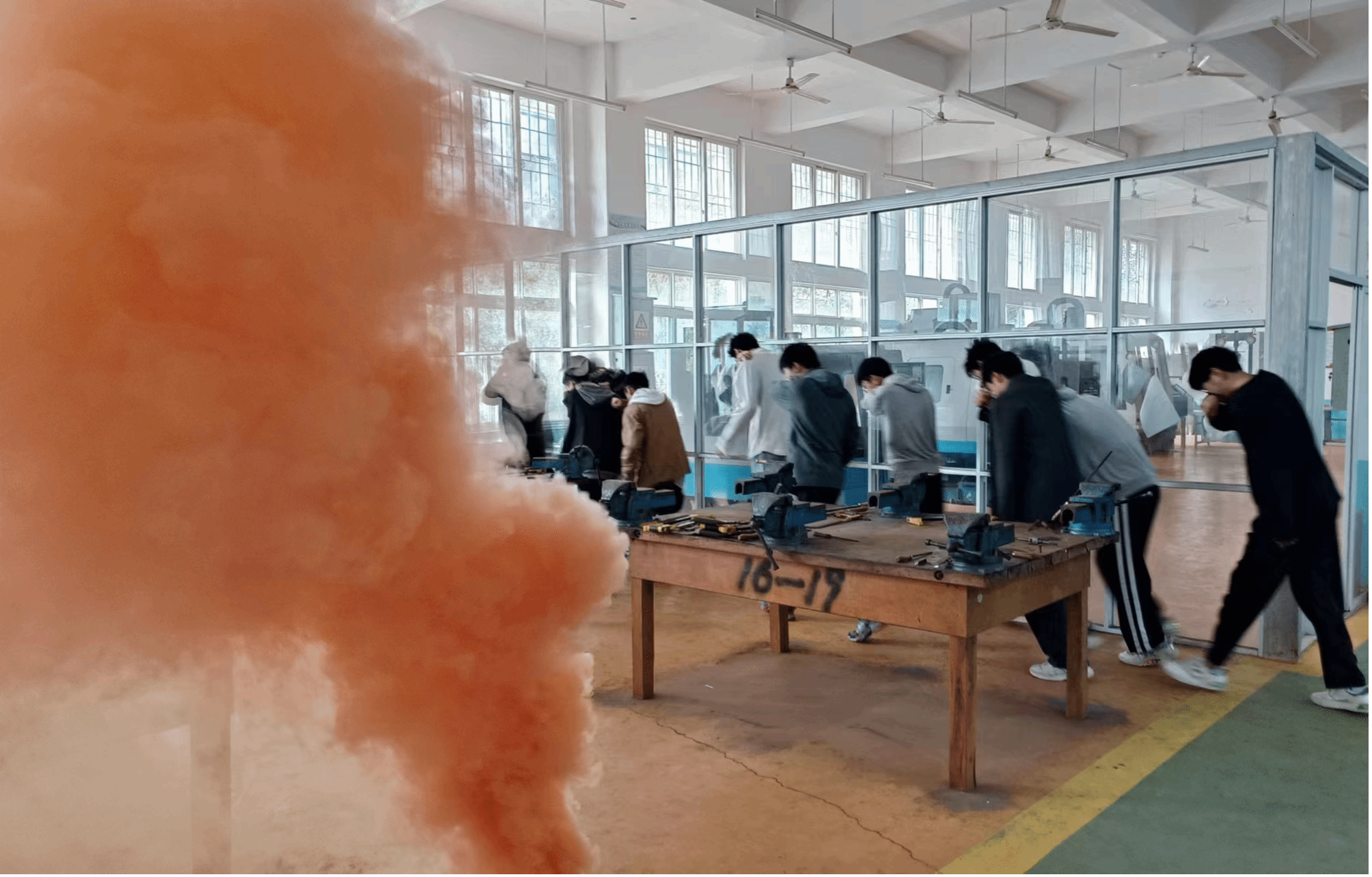 14时30分,应急疏散演练开始,烟雾弹喷出橙色烟雾,师生迅速按照演练方案有序列队,按照既定路线快速、安全的撤离出宿舍到达紧急避险场所,并清点在场人数,确保每一名师生都安全脱险。
