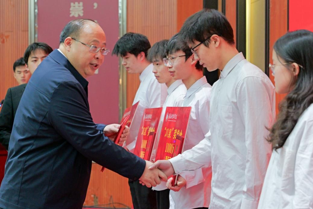 关开荣、肖志华分别宣读了“爱云”奖学金和“川泉”奖学金的获奖者名单,左群为获奖学生颁发荣誉证书及奖学金荣誉牌。