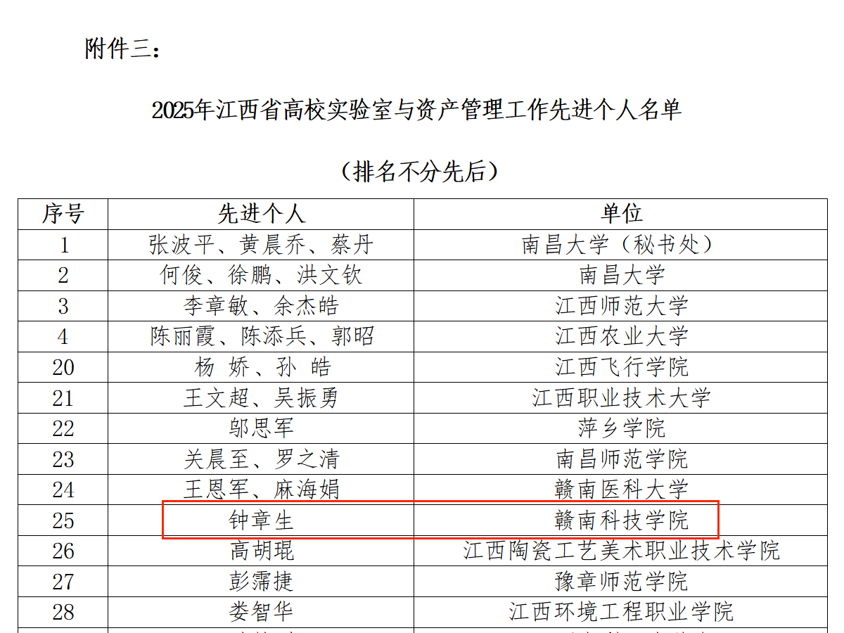 本网讯:近日,江西省高等教育学会发布《关于表彰2025年度全省高校实验室工作先进集体和个人的决定》(赣实发〔2025〕4号),智能制造与材料工程学院实训中心获评“高校实验室与资产管理工作先进团队”,信息学院钟章生老师荣获“高校实验室与资产管理工作先进个人”称号。