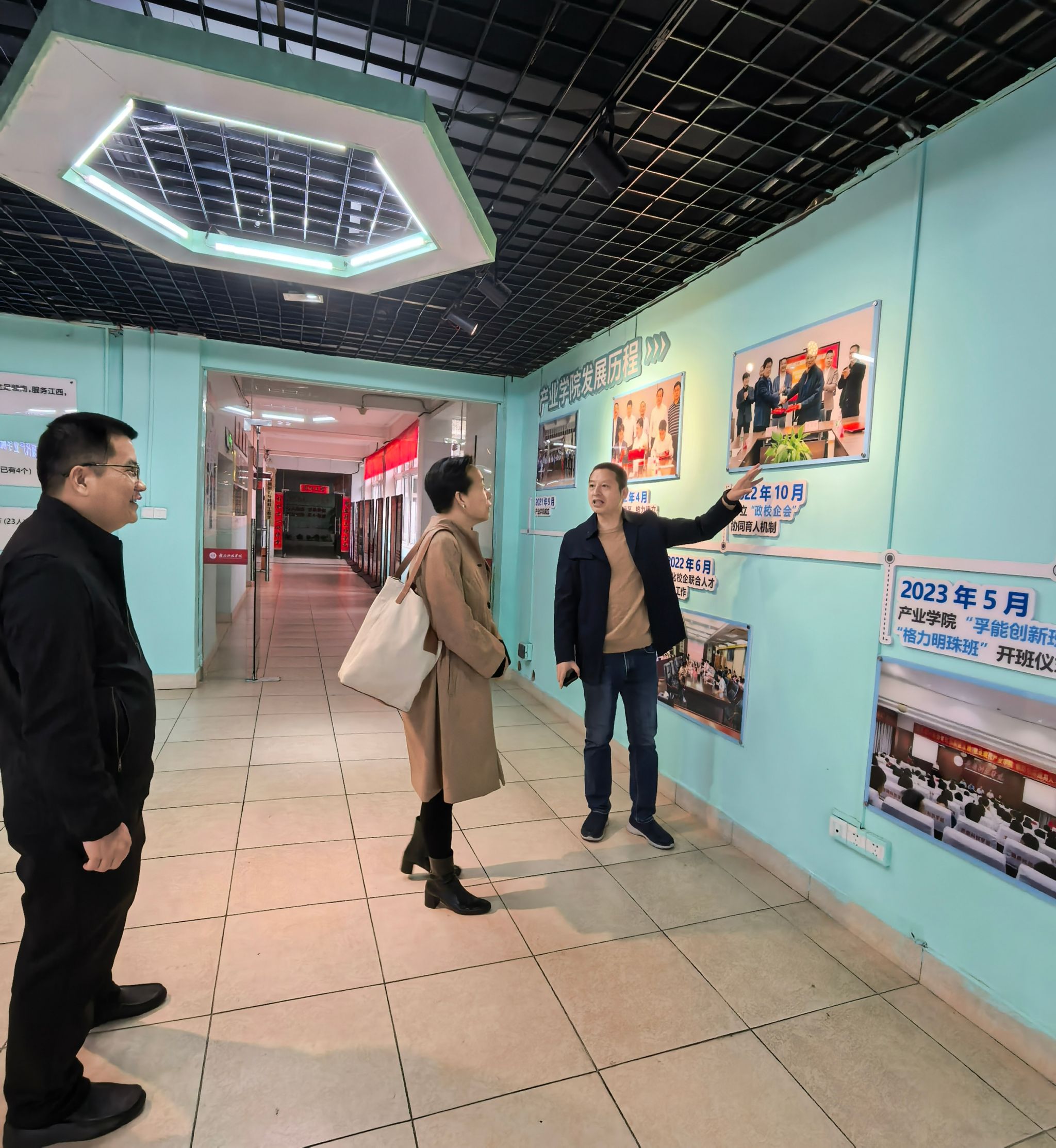 冯慧芳一行参观了智能制造现代产业学院,刘辉详细介绍了智能制造现代产业学院的建设理念、产教融合人才培养模式及“照耀齿轮班”的发展历程和实践成效。