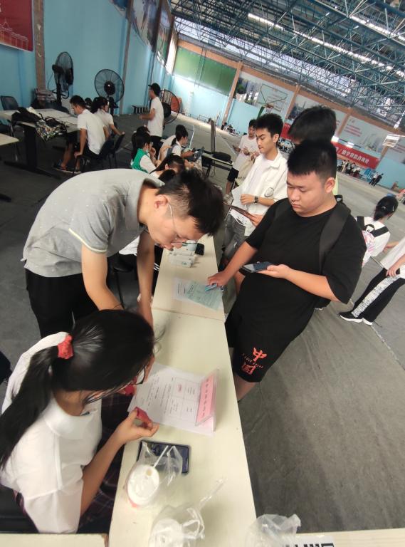 新生报到处的工作人员正在给新生注册,办理入住手续。