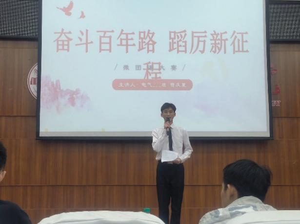 党的二十大临近,本次比赛围绕“喜迎二十大,永远跟党走,奋进新征程”为主题,共派出十六支队伍进行角逐。首先,主持人进行前言介绍,宣布微团课比赛开始,各队伍主讲人依次以ppt形式进行宣讲。比赛过程中,主讲人通过ppt演示以及出色的演讲,向老师和同学们展示了党百年来走过的光辉历程,彰显出红色精神散发的独特魅力,昭示着青年学生们敢于拼搏、勇于担当的使命决心,引发了在场同学们内心的共鸣,激起了阵阵掌声。