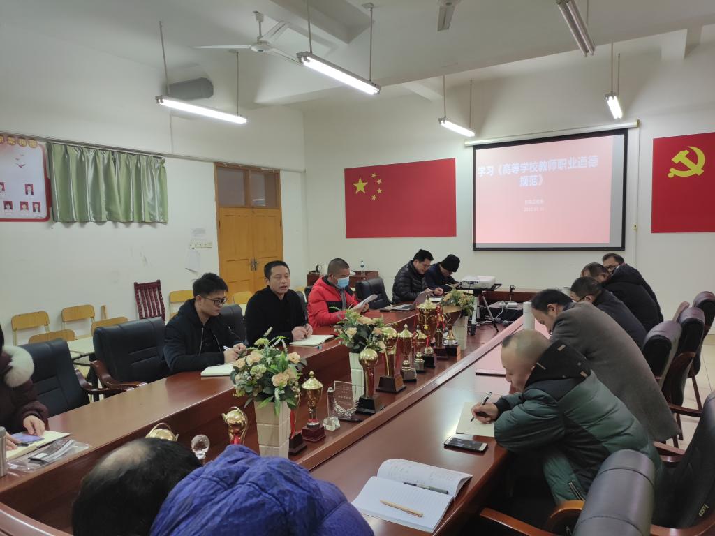 本次会议还布置了教职工2021年度思想政治素质和师德师风综合考核相关工作,由关开荣领学了《高等学校教师职业道德规范》。