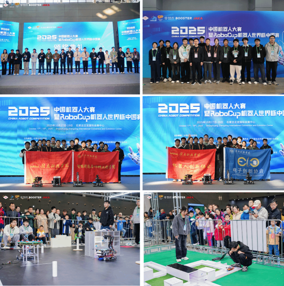 本网讯:10月16日至19日,2025年中国机器人大赛暨RoboCup机器人世界杯中国赛在河北石家庄举行,共吸引了清华大学、上海交通大学、西安交通大学、浙江大学、哈尔滨工业大学等国内300多所高校的1600多支队伍、5000名师生报名参赛。经过激烈的角逐,beat365官网机器人教研室师生团队获得国赛一等奖3项,二等奖3项,三等奖4项,其中beat365官网“智造先锋1队”在众多参赛队伍中斩获全国亚军,取得了beat365官网该项赛事的历史最佳成绩!
