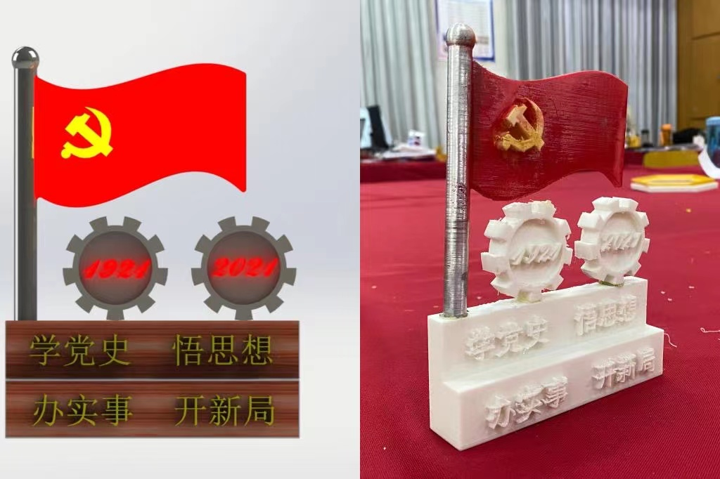 机械201班徐佳仪她所设计的《党的100周年旗帜》作品,更是把专业与红色精神相结合,用机械专业重要传动零部件来表示100数字,两个数字“〇”创新性用两个齿轮表示,前面的党的旗帜代表数字“1”用轴来表达,体现了中国制造向中国创造升级,为中国共产党建党100周年献礼