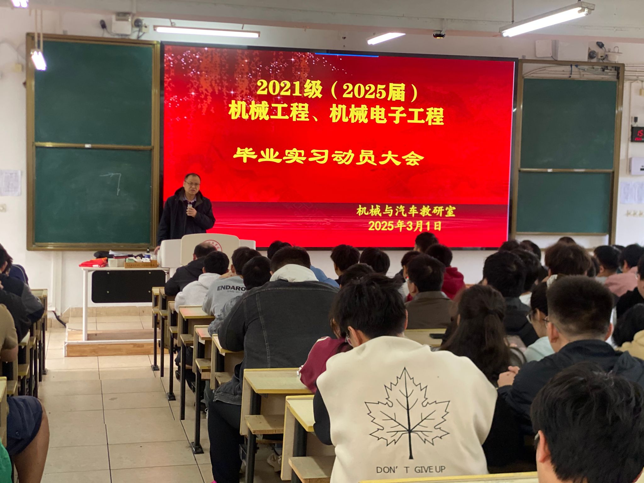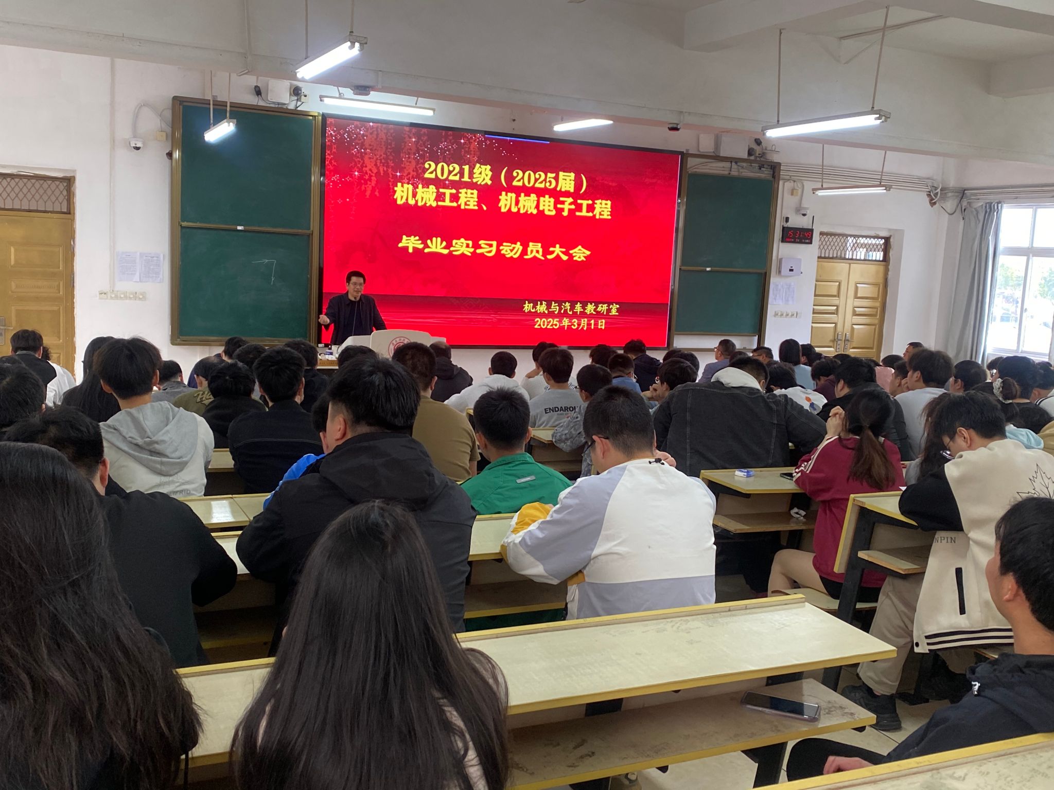 本网讯:3月1日下午,beat365平台官方网站机械与汽车教研室在教学主楼Z1D1教室召开了2021级学生毕业实习动员大会。学院党委委员关开荣、机械与汽车教研室主任刘伟,副主任刘斌、实习带队教师以及机械211班、机电211班、机电212班、机电213班、机电214班学生参加动员大会,会议由刘伟主持。
