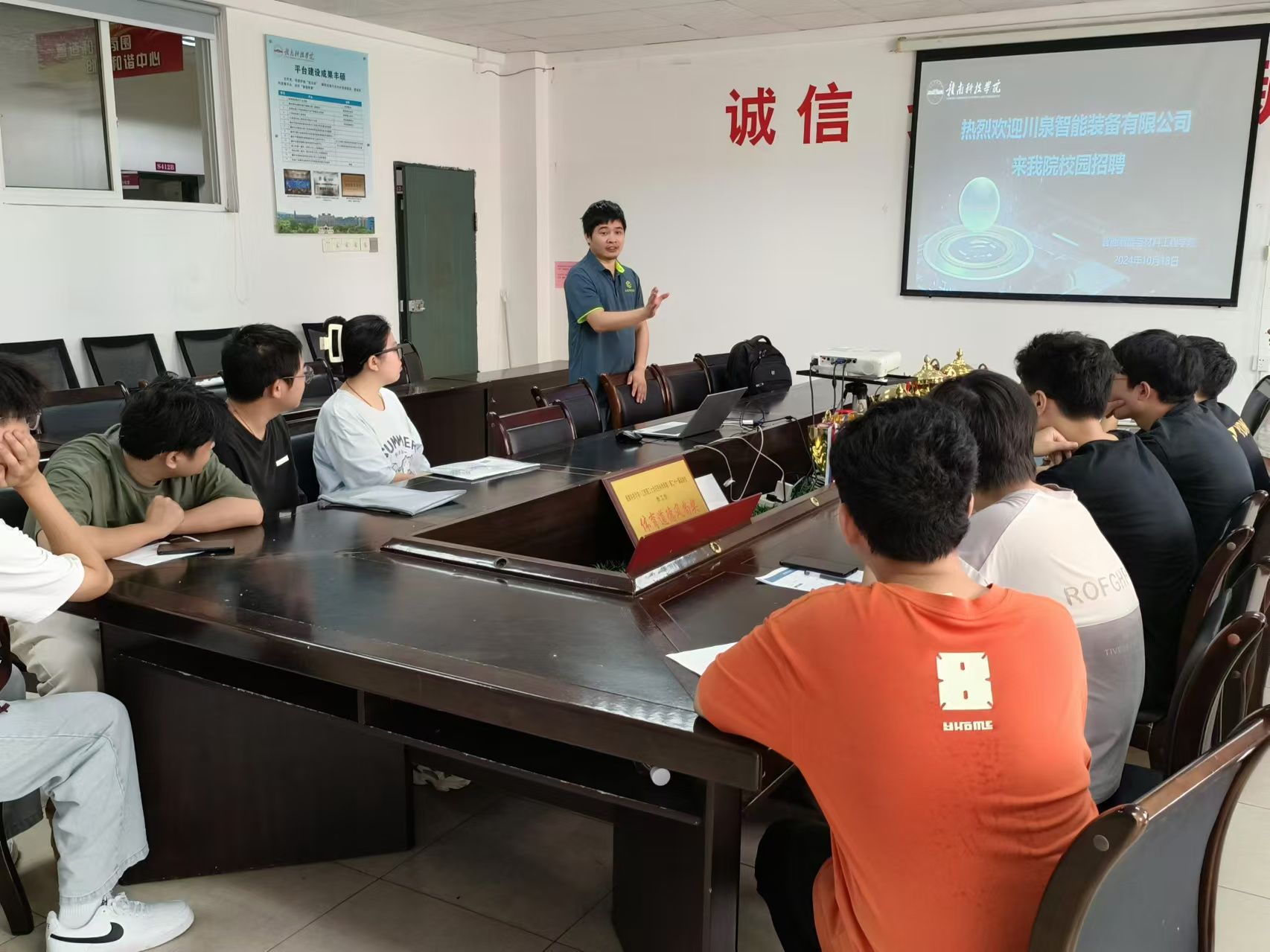 招聘会上,曾庆鸿主要对川泉智能装备有限公司的主营业务、企业文化、人才培养模式和员工未来发展等方面进行了介绍并就同学们关于公司待遇、工作环境、工作内容以及放假休息等疑问进行了解答。