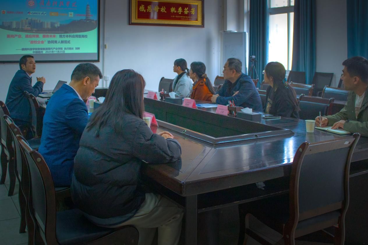 随后的座谈交流会上,智能制造现代产业学院产业服务部主任葛德亮详细介绍了学院的发展历程、专业设置、人才培养模式、师资力量以及科研与社会服务能力。全南县众谊越泰有限公司副总经理罗隆材随后介绍了企业的基本情况、主营业务、发展前景以及企业文化。他特别提到了企业在快速发展过程中对专业技术人才和管理人才的迫切需求,表达了与学院建立长期稳定人才合作关系的强烈意愿。