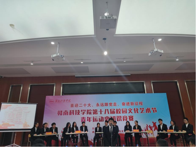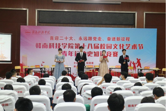 本网讯:为喜迎中国共产主义青年团成立100周年,进一步活跃校园文化气氛。丰富大学生课余生活,给同学们一个展示自己的舞台,进一步营造良好的学习氛围。陶冶同学们高尚的道德情操,启发大学生的创作灵感。锻炼同学们的知识储备,促进同学们之间的交流。5月7日,机电工程系于图书馆报告厅承办“喜迎二十大、永远跟党走,奋斗新征程” 第十八届校园文化艺术节青年运动史知识竞赛。莅临此次活动的嘉宾有校团委书记李敏、机电工程系副主任肖志华、机电工程系团总支书记张敏、人文科学系团总支书记郭豪、经济管理系王博文、建设工程系董宇鹏。