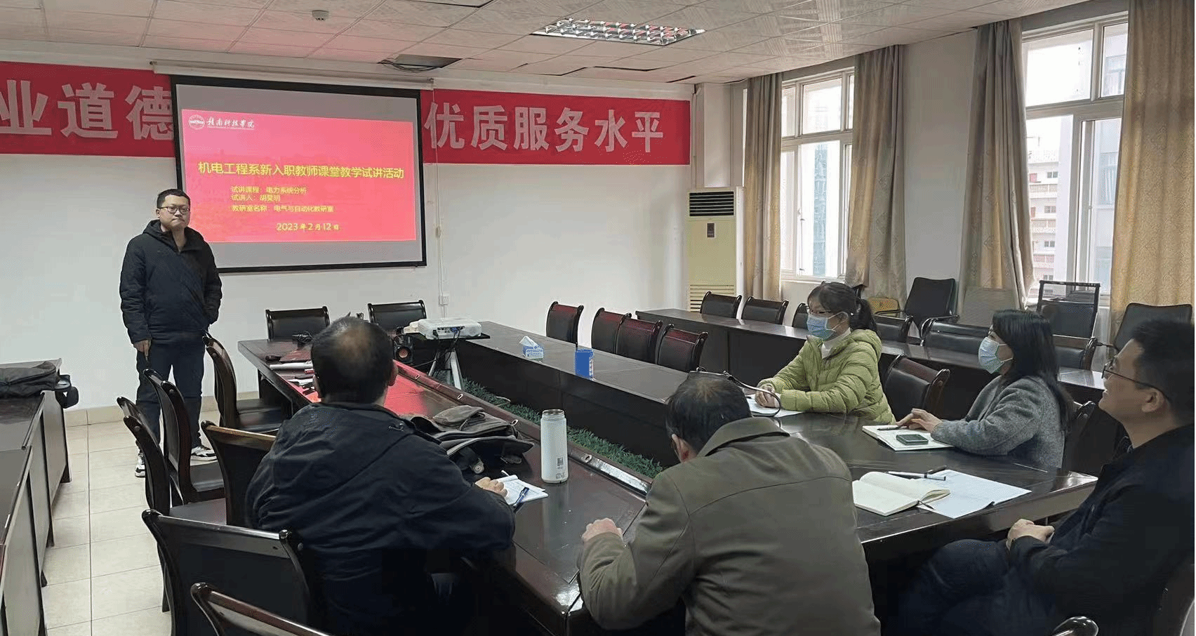 电气与自动化教研室的郭权和胡昊明两位新老师分别就本学期新授课程进行了试讲。试讲结束后,各位老师就试讲过程中的板书与PPT的结合、与学生的互动、知识的拓展等方面提出了建议和意见。提醒新教师应注意的内容衔接、案例的引入、授课内容的重点和难点的强调等。