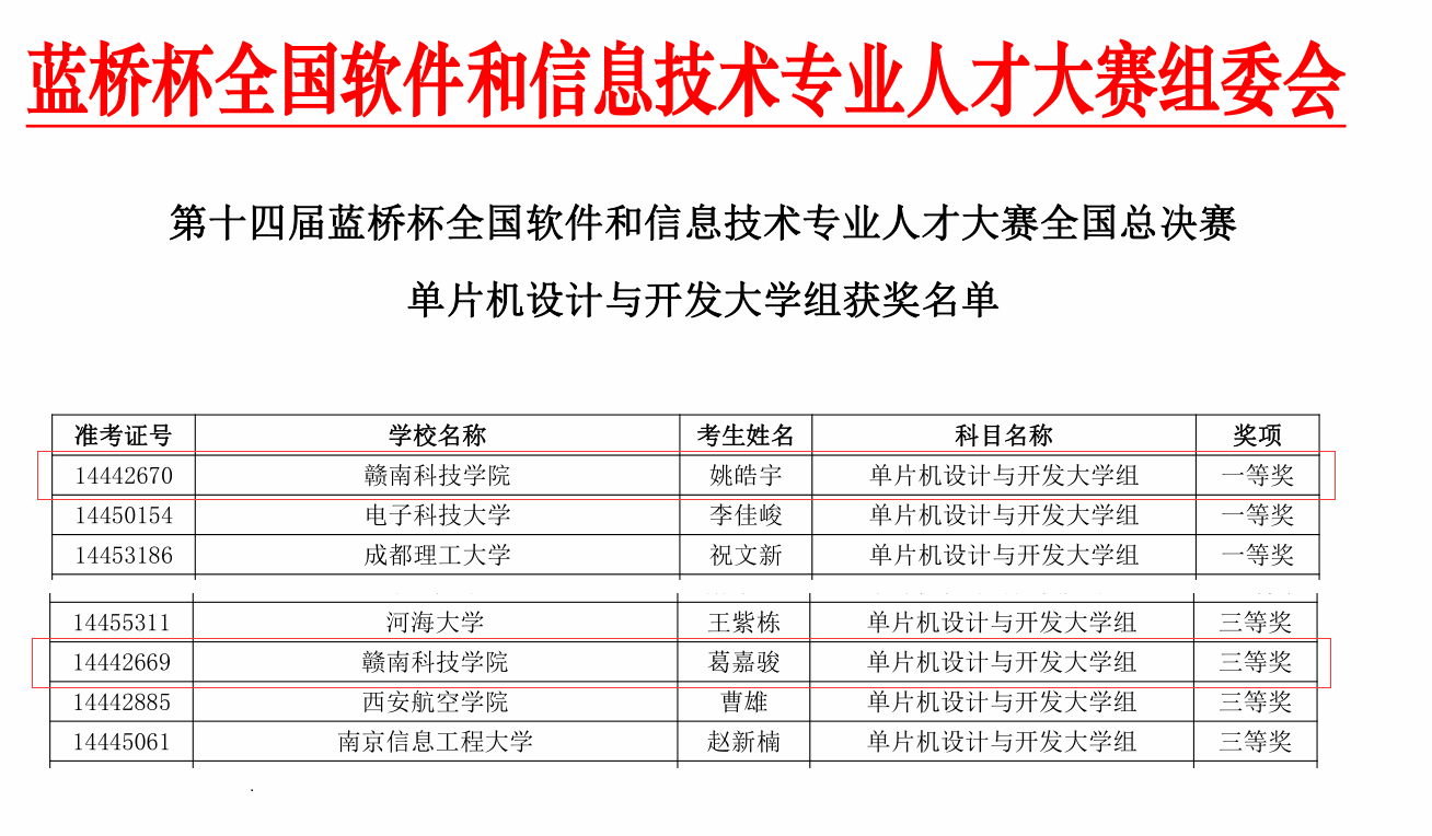 beat365平台官方网站学子电气201班姚皓宇和机械204班葛嘉骏参加了南昌大学赛点单片机设计与开发大学组的决赛,并荣获一等奖1项,三等奖1项的优异成绩,其中姚皓宇同学获得一等奖第一名,取得beat365官网在该赛事新的突破。成绩的取得是学生平时刻苦训练的成果,这其中也凝聚了指导老师们的心血。通过参加该项赛事,学生获得很好的锻炼机会,增强了创新思维、实践经验并且提高了嵌入式开发设计能力。