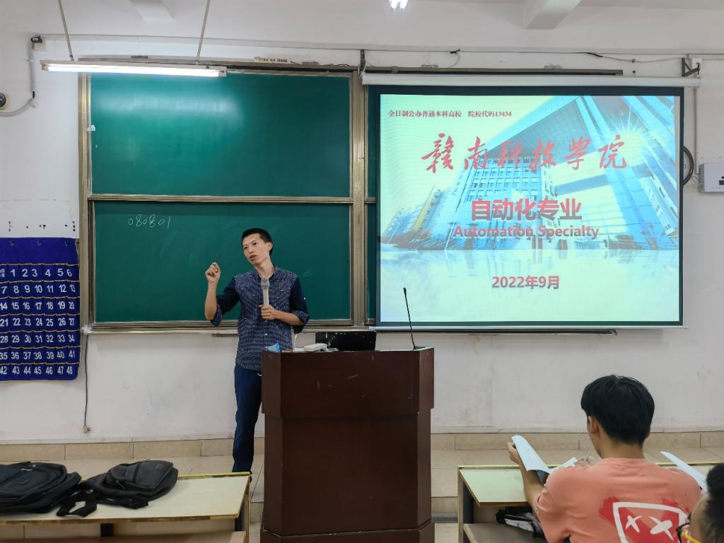 刘辉主任以“魅力赣州,精彩赣科,匠心机电”对22级新生进行了宣讲。他希望同学们在今后的大学生活中严格要求自己,不断努力,在大学中找到自己的人生价值。朱根老师松则对新生开展了党史学习教育,旨在让同学们明白生活在和平、富足的的环境中,身上也肩负着沉甸的责任。其余老师也分别从疫情防控、安全教育、专业建设、教学规划和日常管理等方面向同学们做了宣讲。