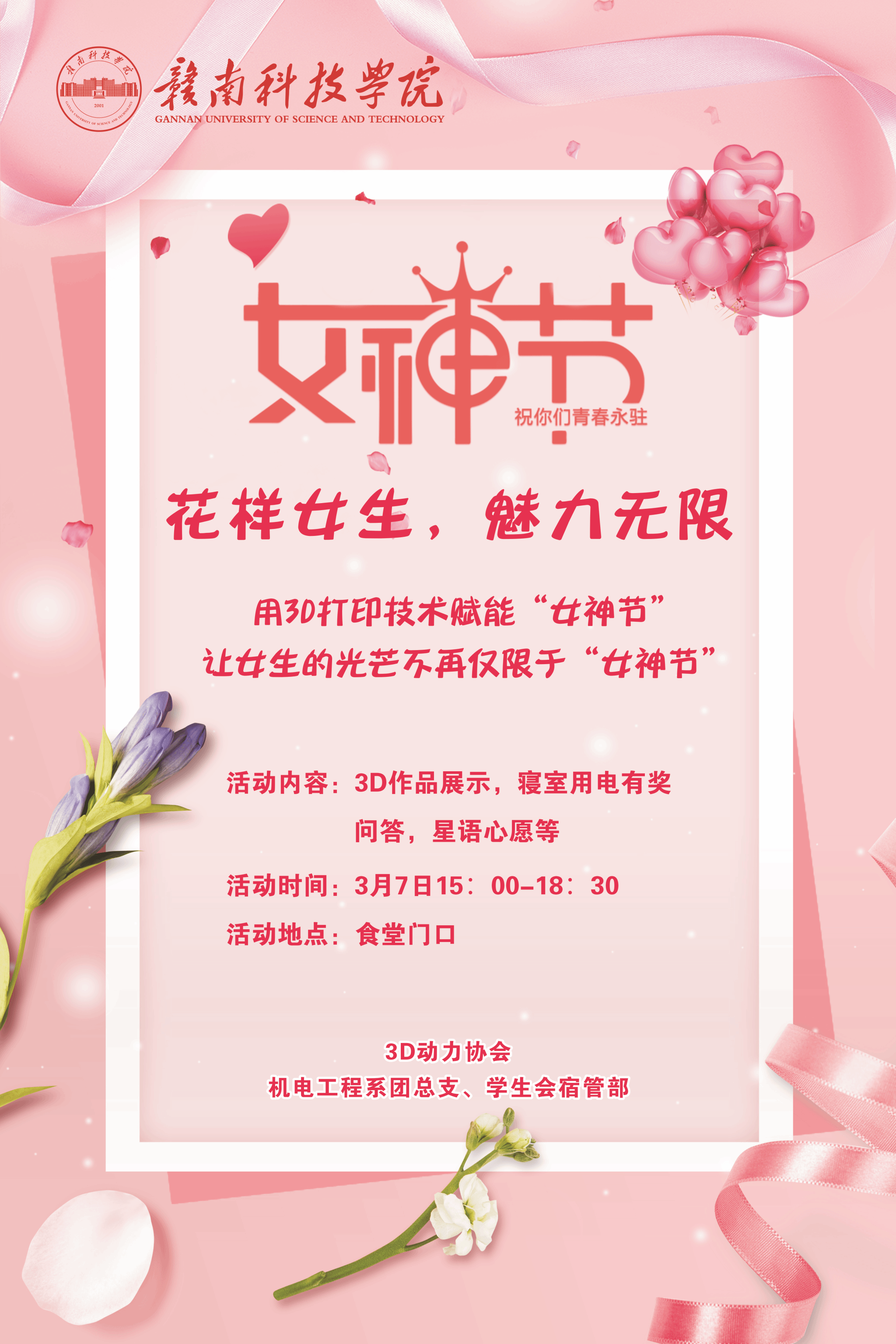 本网讯:春暖花开时,魅力四射日,在这三月和煦的春风里,为丰富校园文化生活,关怀beat365官网广大女生,展现在校女大学生风采,放飞梦想,构建和谐校园。3月7日下午,beat365平台官方网站机电工程系团总支学生会协同3D动力协会为女生们搭建了一个展示自我的舞台,并送上温馨的节日祝福。