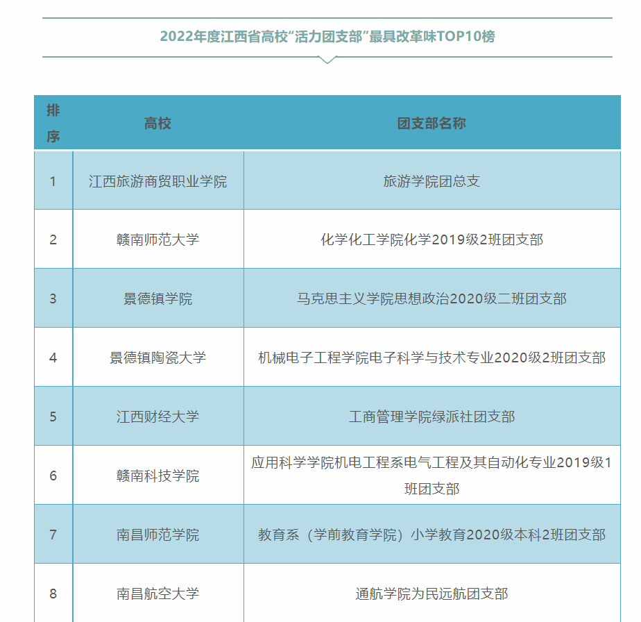 团省委、省学联参考各高校点赞转发数量,结合团支部、社团建设成果和日常工作了解,最终确定《2022年度江西省高校“活力团支部”最具(引领力、组织力、服务力、贡献度、改革味、好作风)TOP10榜》和《2022年度江西省高校“活力社团”TOP10榜》。其中,江西理工大学应用科学学院机电工程系电气工程及其自动化专业2019级1班团支部荣获江西省高校“活力团支部”称号。